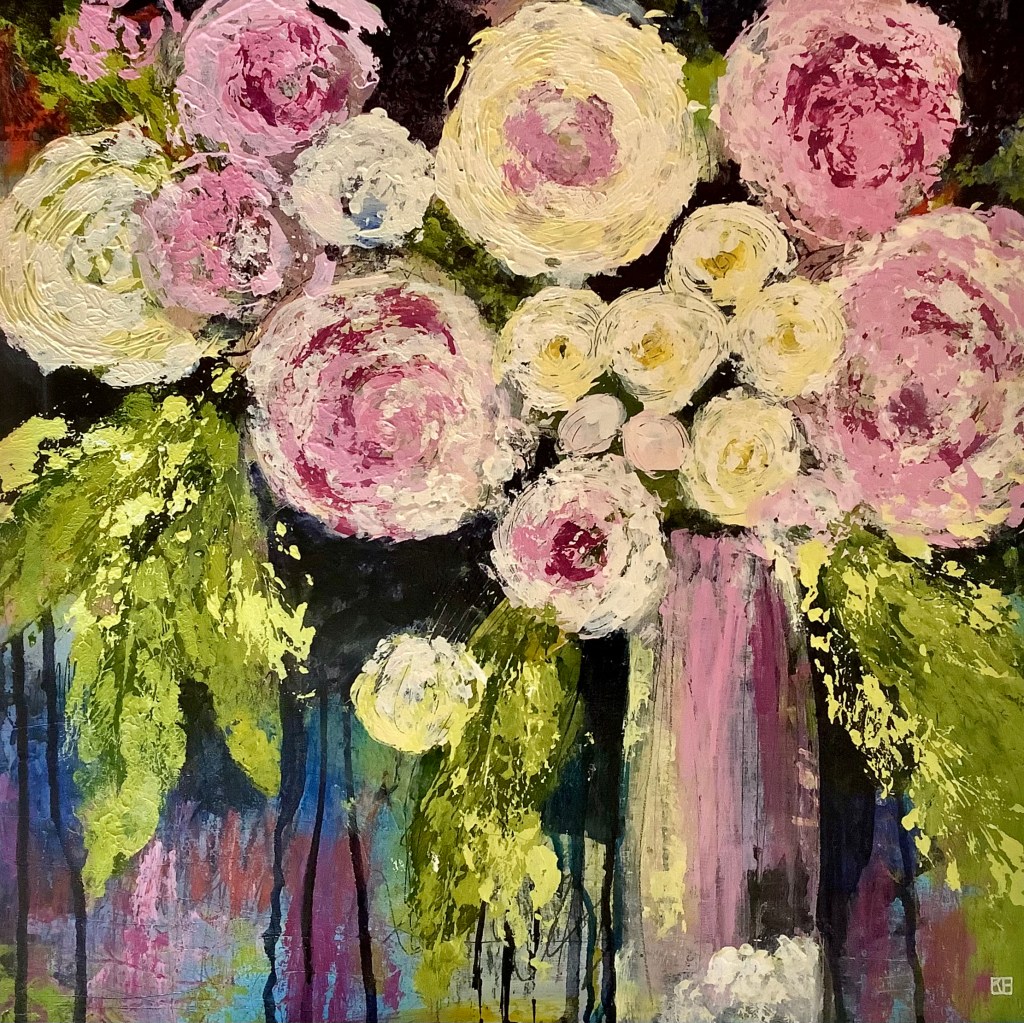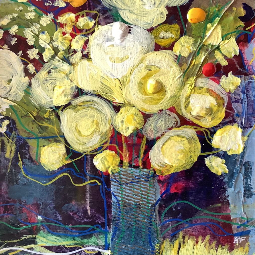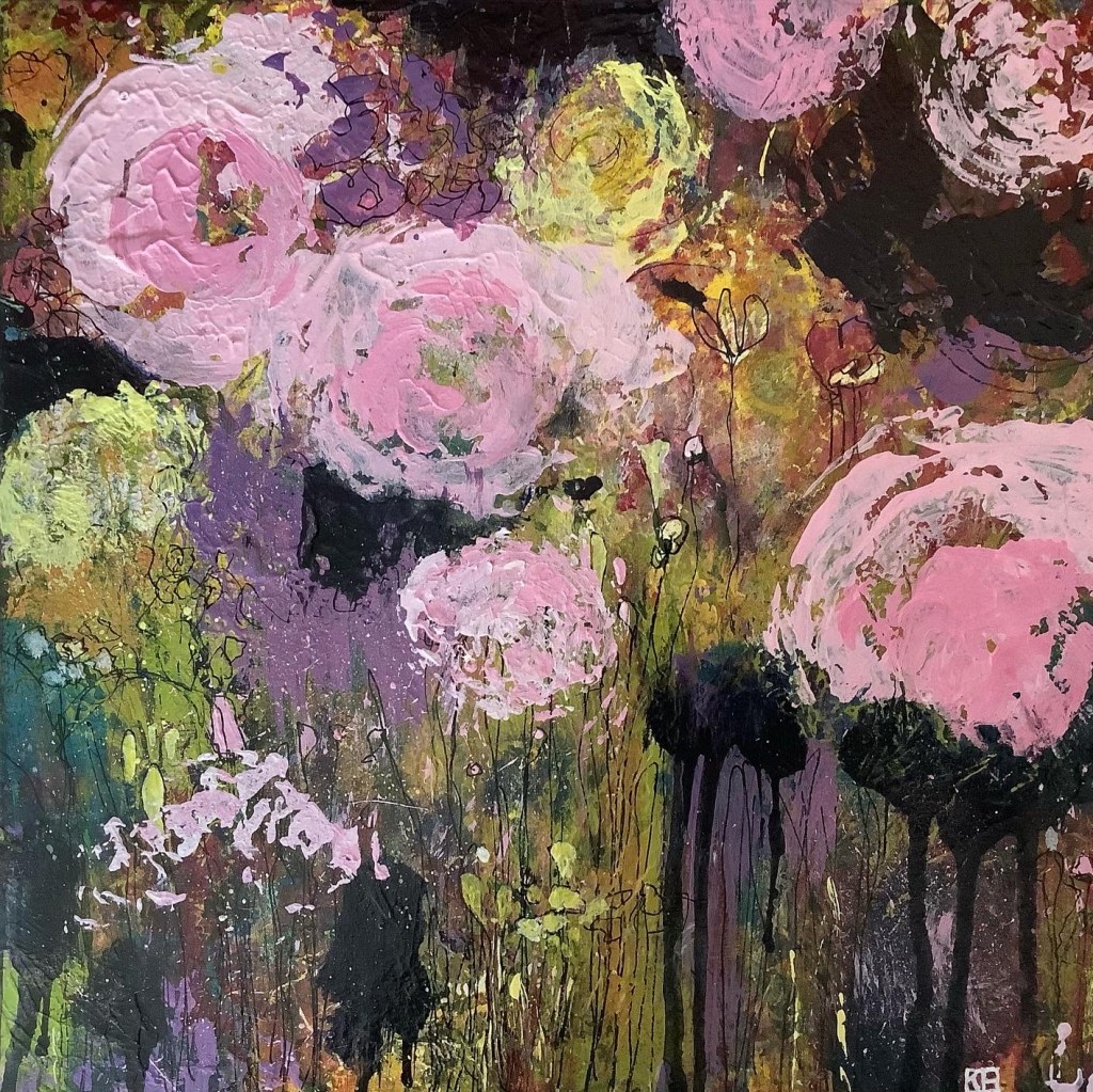 Recently the pandemic necessitated that I focus more closely on the flora of our parks and gardens and my own cottage garden in particular. Colour is a huge component of my practice and I work in a loose, expressive and experimental fashion. Using mixed media, collage and acrylics to build up many layers, sanding and scraping back.