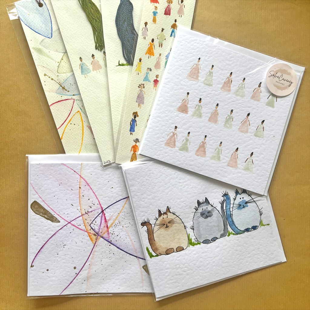 My themes are usually centred around people and feelings. I create work on canvas , paper and hand painted cards.