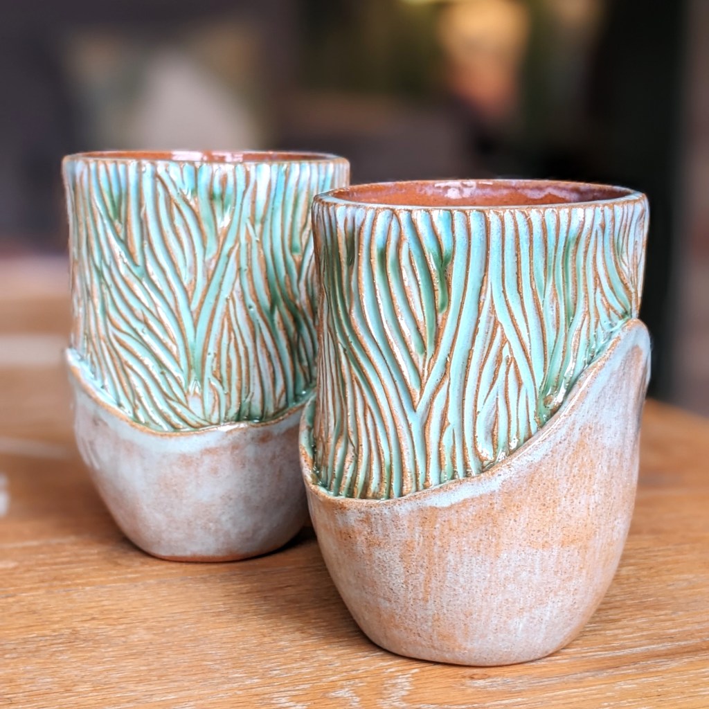 Currently working with terracotta, I love to play with texture; carving, building up elements or using my hand carved lino prints to create unusual surfaces that the glaze interacts with in mesmerising ways.